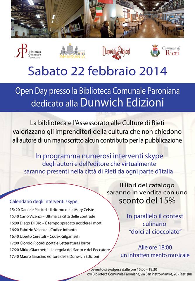 Sarà la prima della serie, e avverrà via Skype il prossimo sabato, 22 febbraio. La presentazione di Codice infranto rientrerà nell’Open Day dedicato alla Dunwich Edizioni presso la Biblioteca Comunale Paroniana, organizzato dalla biblioteca e dall’Assessorato alle Culture di Rieti. In programma numerosi interventi skype, oltre il mio, che inizierà alle 16.20 per terminare una ventina di minuti dopo, ma non solo: partecipando all’evento presso la biblioteca potrete far lavorare le papille gustative e acquistare i libri dell’editore. Il mio non sarà ancora pronto, per quella data.