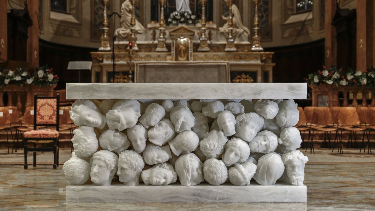 La mimesi. Ogni forma d’arte è mimesi, imitazione della natura, e lo è in quanto l’Essere Umano percepisce nella natura e nel mondo che lo circonda una presenza che non può essere ridotta unicamente all’essere proprio dell’Umano. Anche la presenza dell’Umano nella natura rimanda simbolicamente alla presenza di qualcun altro o di un altro ambito, che è quello divino. Il divino parla o gli viene data possibilità di parlare attraverso l’arte, perché essa è sistema simbolico di natura derivata o di secondo grado. In questo caso, l’altare di Parmiggiani rappresenta le teste di statue di altri artisti: vi è un richiamo mimetico all’arte di “altra” tradizione, reinterpretata in funzione della necessità religiosa dell’altare. Dal momento che l’altare cristiano è sempre sorto sulle reliquie dei martiri, le statue a cui ci si riferisce in questo altare diventano l’occasione per considerare ogni espressione artistica dell’uomo, di qualunque epoca, membra del corpo mistico di Cristo.